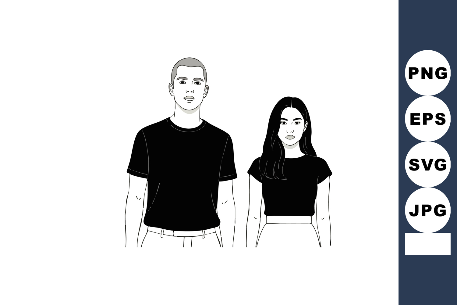 This vector depicts a young man and woman standing together wearing casual black tops in a minimalist black and white style, creating a neutral calm mood.