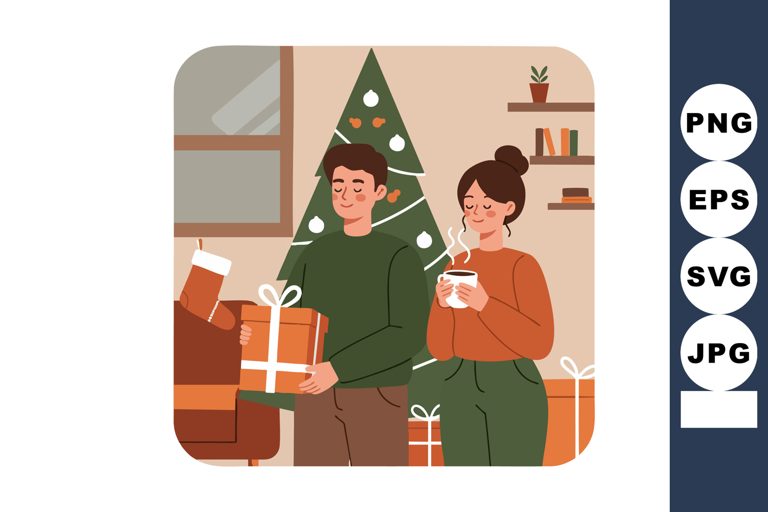 Similar Design Products to Couple enjoying cozy Christmas celebration with gift and hot