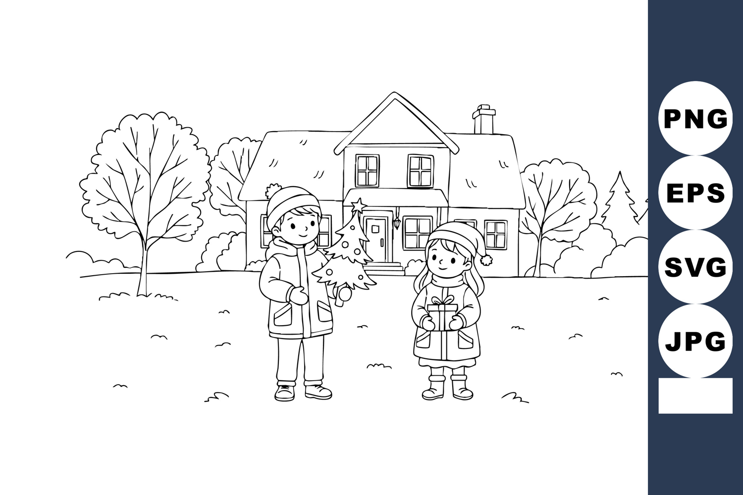 Two children stand outdoors in winter clothing near a house surrounded by trees in a calm winter setting. Peaceful mood.