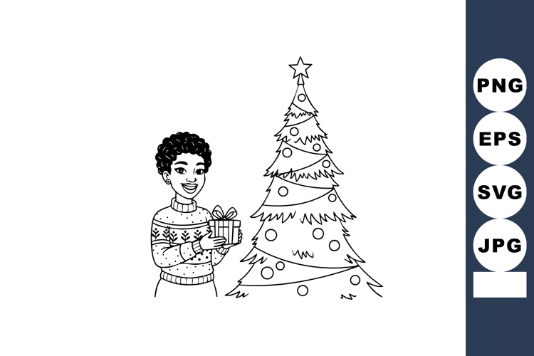 Woman stands beside decorated Christmas tree holding wrapped gift in festive sweater. Scene shows winter holiday celebration with joyful mood.