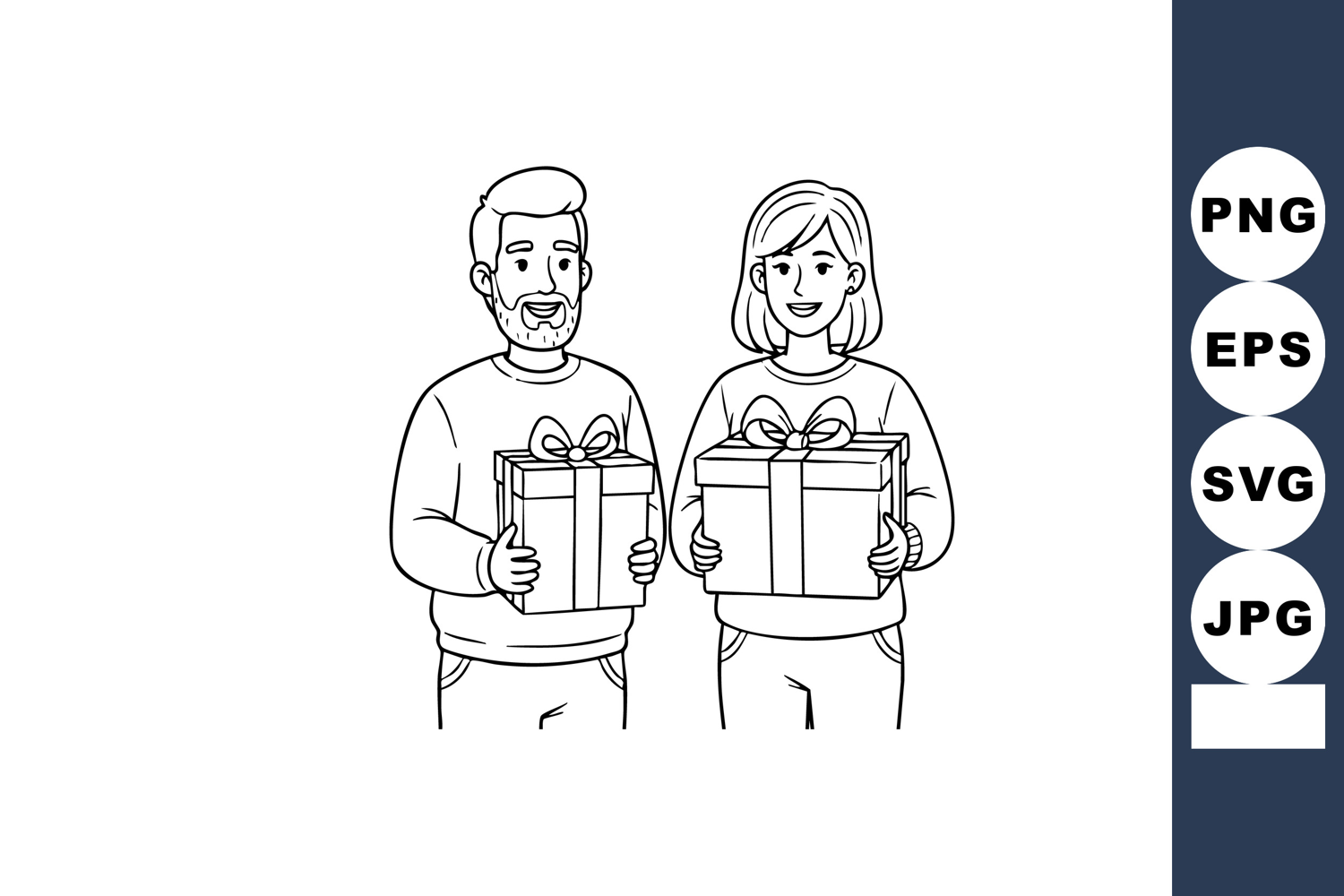 Illustration shows a man and woman smiling while holding gift boxes, representing celebration and togetherness in a cheerful mood.