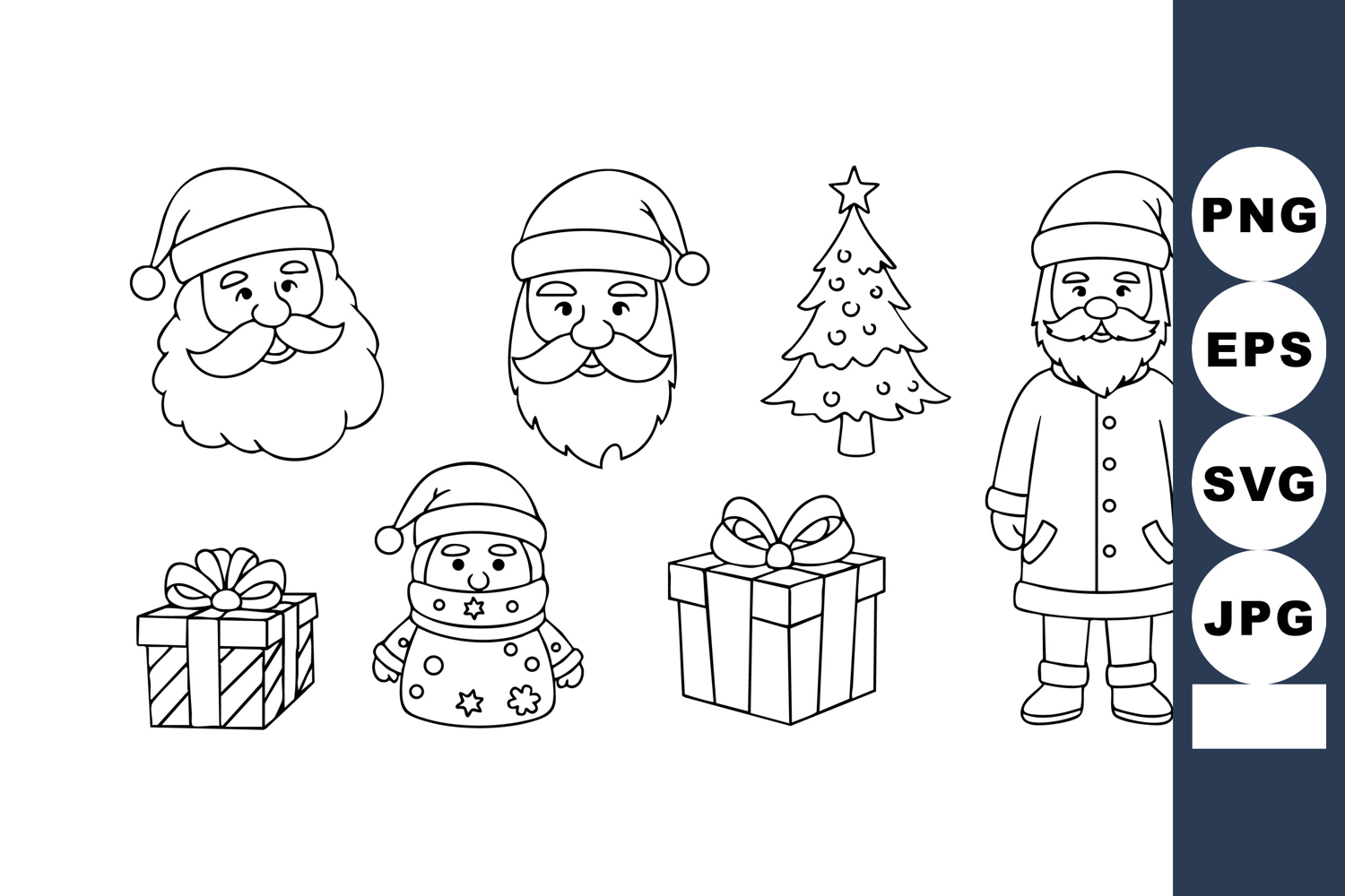 This vector line art features Santa Claus faces, a full body figure, Christmas tree, and gift boxes, capturing festive holiday spirit in simple black strokes. Cheerful.