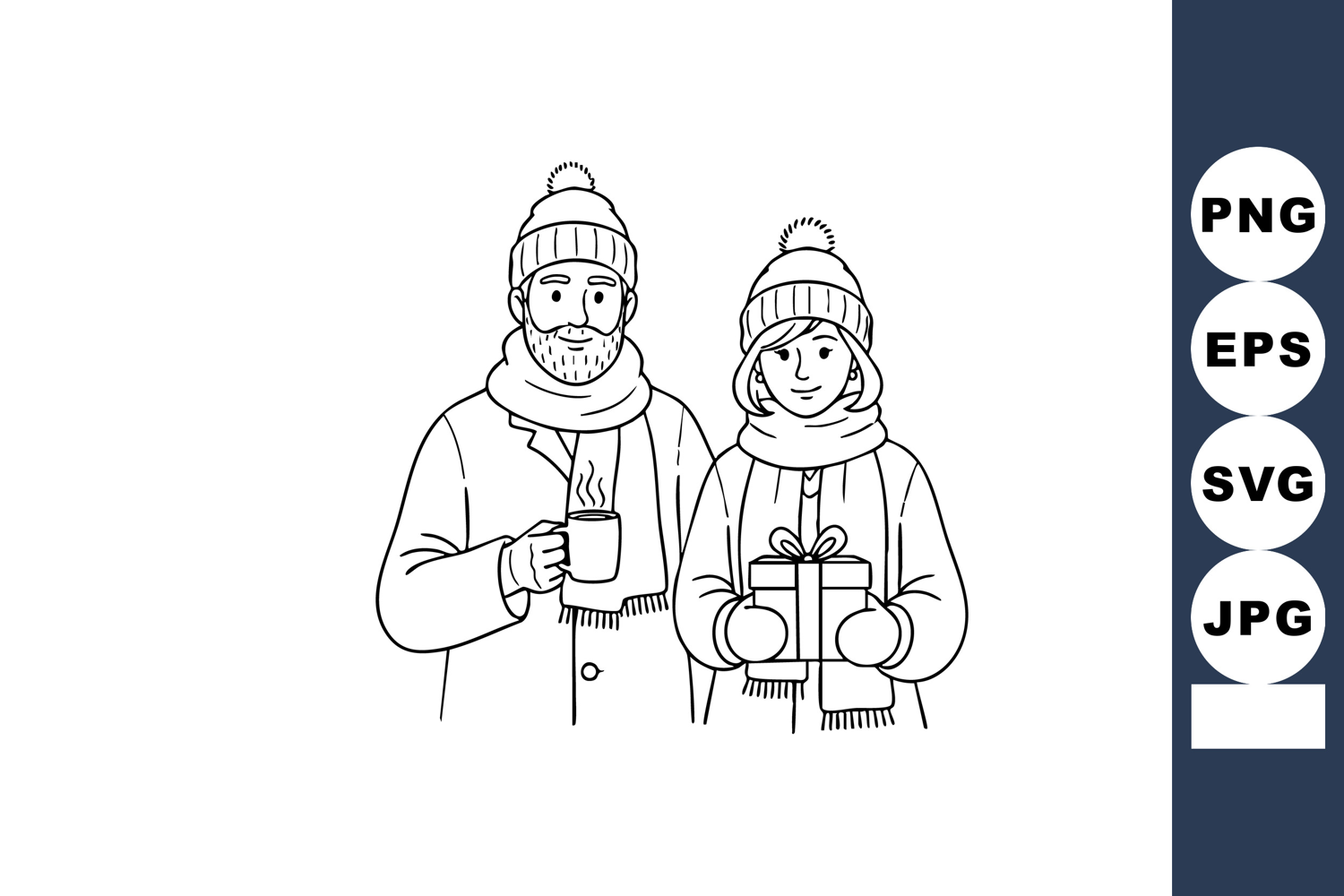 Vector line art of a couple in winter clothing holding a gift and cup, representing warmth and holiday spirit, cozy and cheerful.