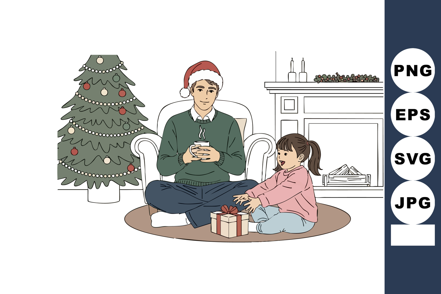 Family Holiday Tree Christmas Celebration Present Gift Fireplace Father Daughter