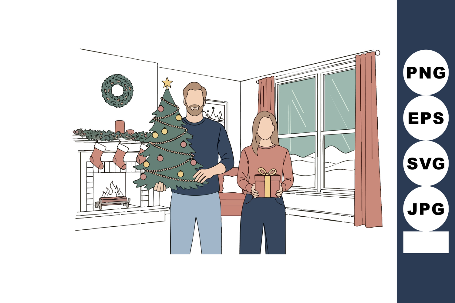 Similar Design Products to Couple holding decorated Christmas tree and gift box in cozy