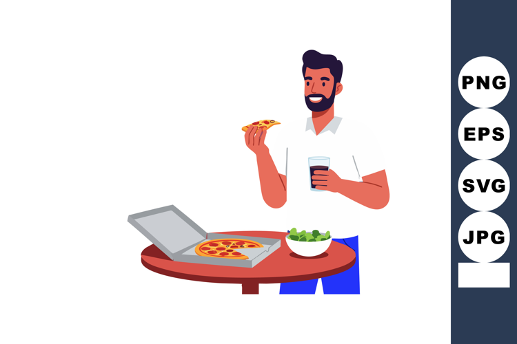 Similar Design Products to Man enjoying pizza slice with drink and salad on table casua