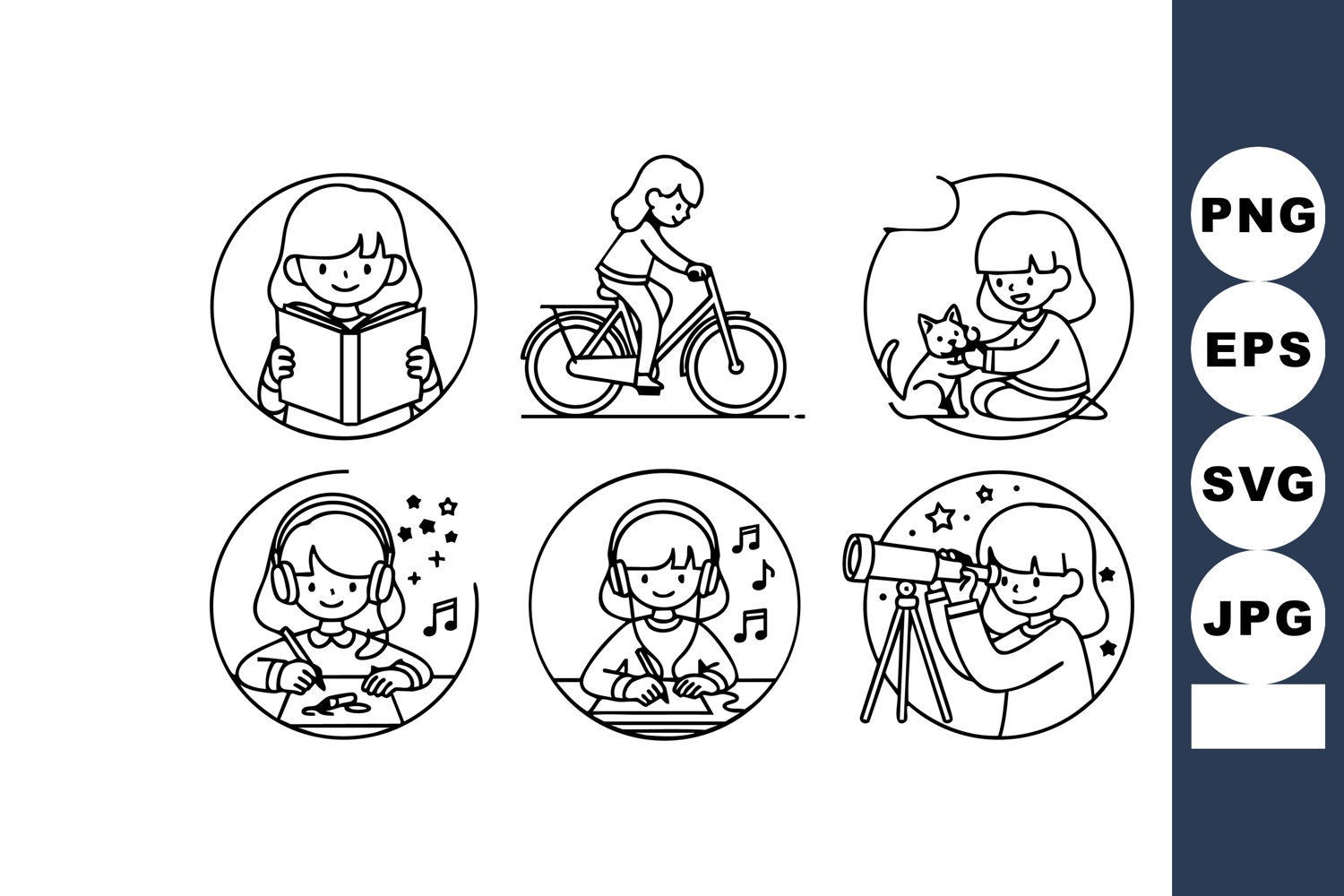 Children participate in reading, cycling, caring for pets, listening to music, and stargazing in minimalistic black line art style, creating a playful and creative mood.