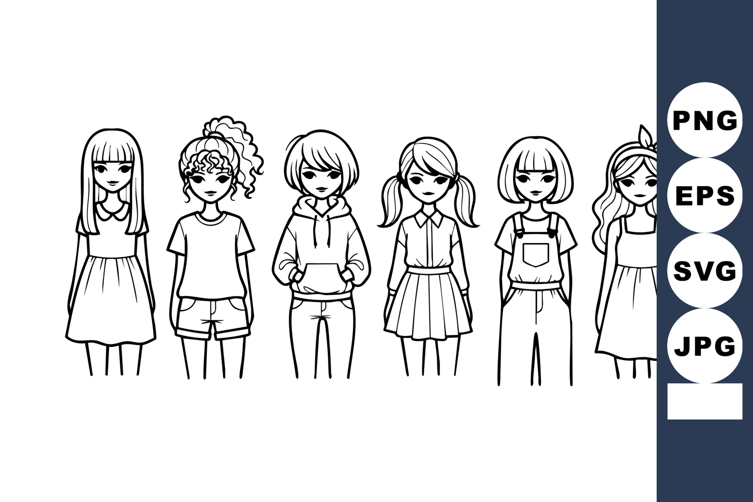Vector illustration of six young girls standing side by side wearing casual clothes with varied hairstyles in black and white line art style, simple and cheerful.