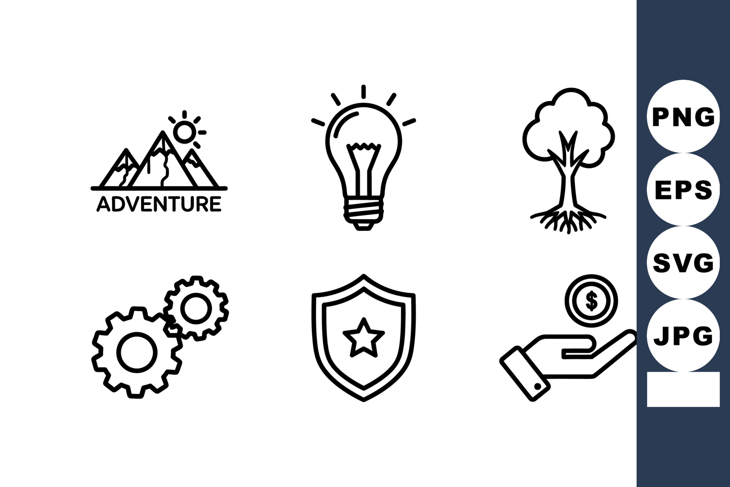 Set of black line vector icons including mountain adventure, light bulb, tree, gears, shield, and hand with coin representing ideas and protection, creative mood.