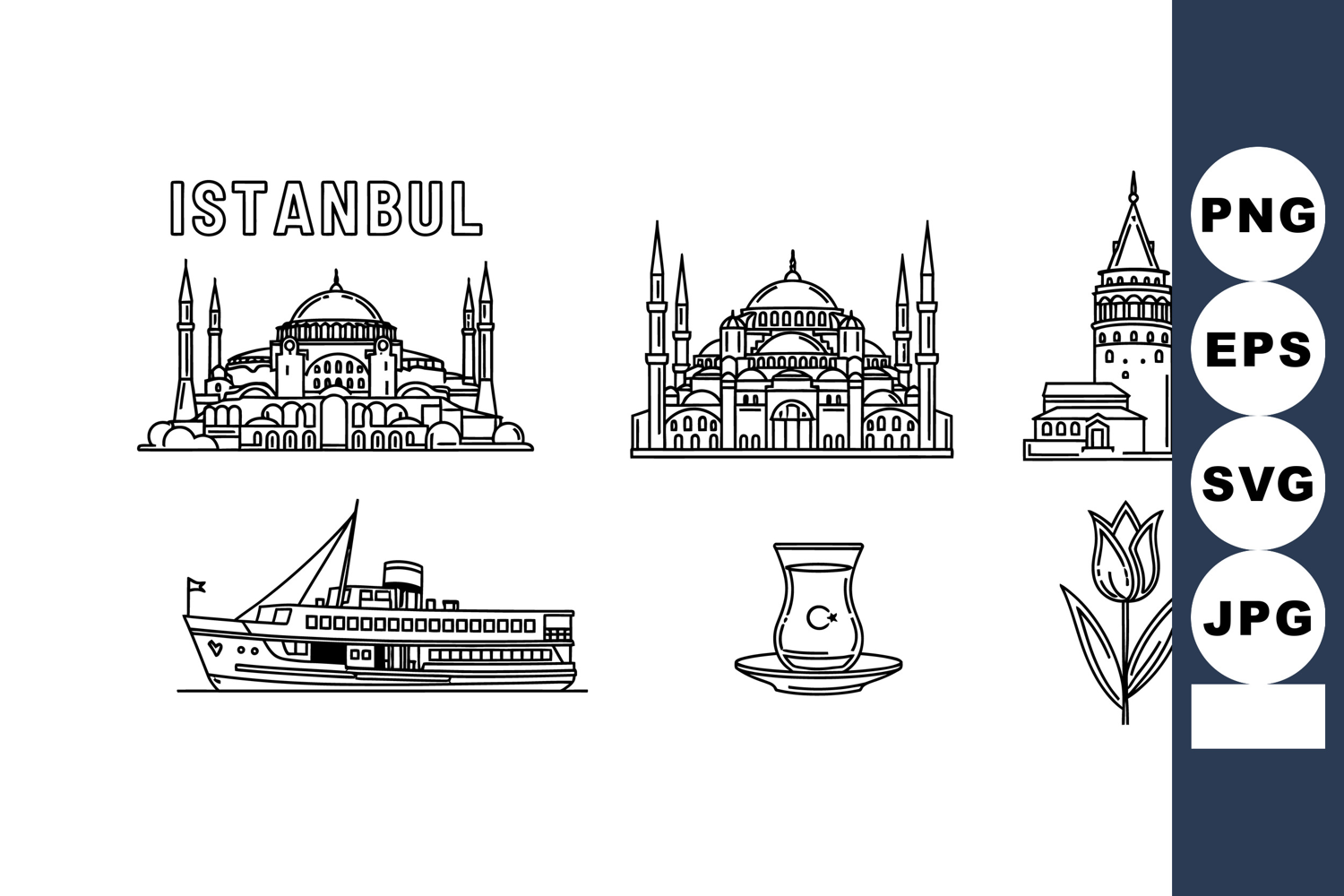 Vector set shows Istanbul famous landmarks including mosques, Galata Tower, ferry, tulip flower, and tea glass in outline style, cultural and historic mood.