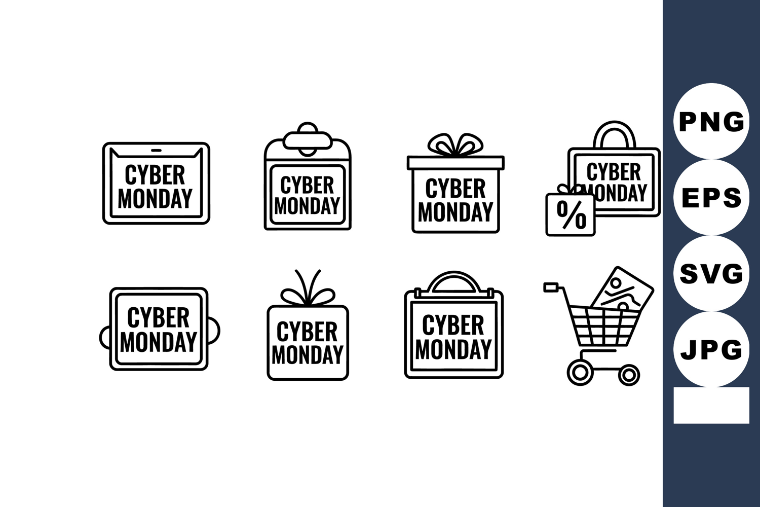 Vector set shows black and white Cyber Monday icons including shopping cart, gift box, tags, and labels for online sale promotions, modern and clear style.