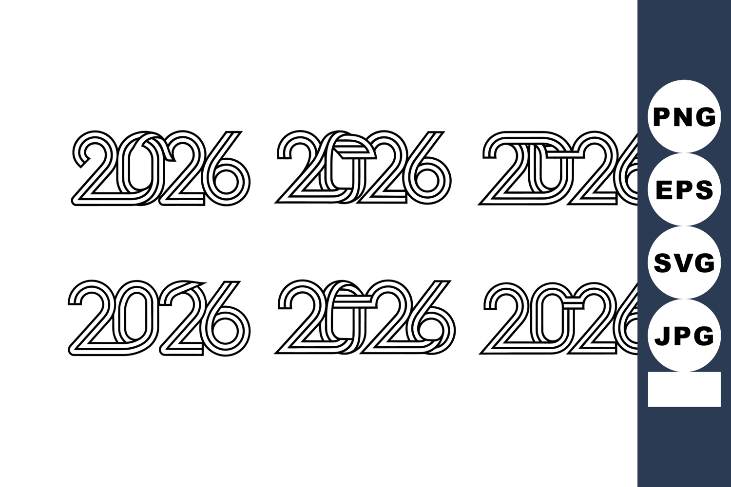 This vector file displays six 2026 year number outline designs in black and white, suitable for contemporary graphic projects and digital use. Creative and clear.