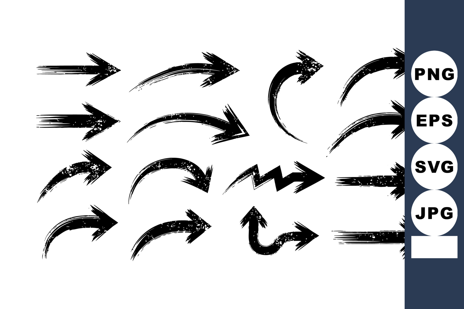 This vector features a collection of black grunge arrows in various directions for design and navigation purposes, creating a dynamic and edgy mood.