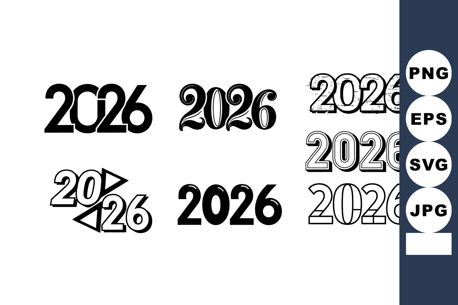 This vector image shows the number 2026 in six different black and white styles with various fonts and outlines, creating a bold and modern look. Crisp design, minimalistic mood.