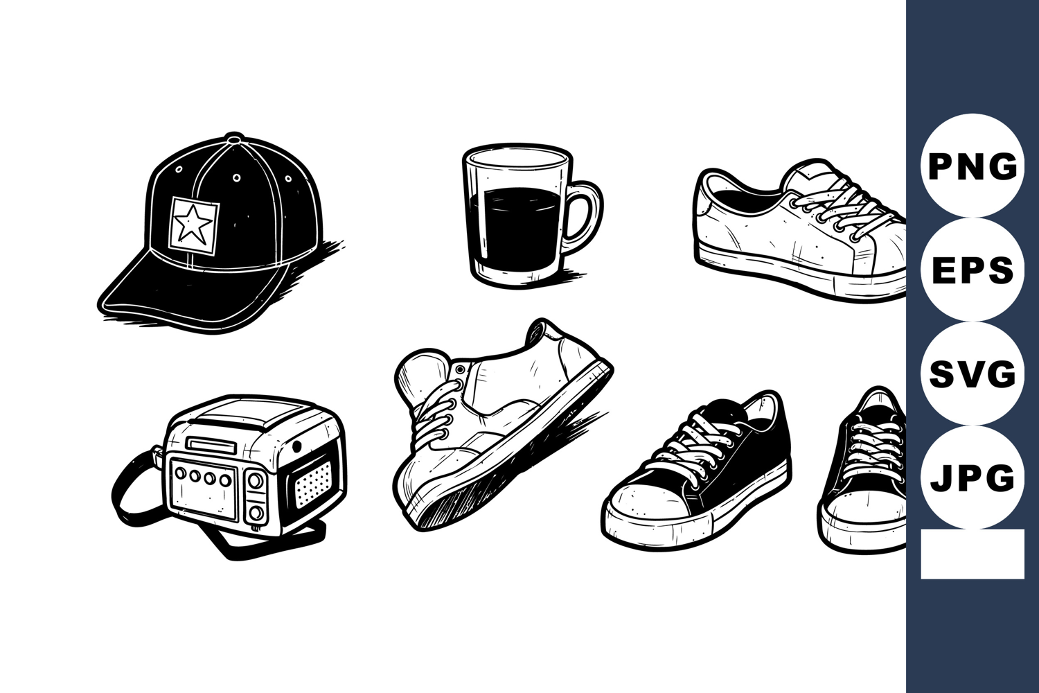 Illustration shows hand drawn casual accessories including cap, mug, sneakers, and camera in black and white style, artistic and creative.
