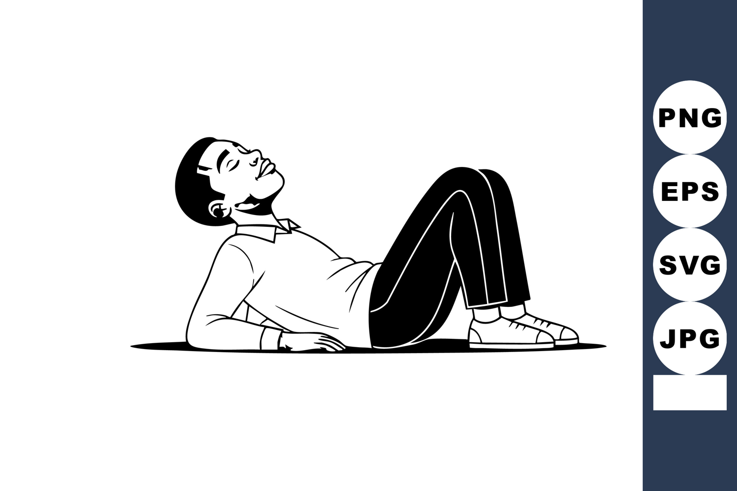 Illustration shows a man reclining on the ground with eyes closed, dressed casually in black and white outfit, calm and peaceful mood.