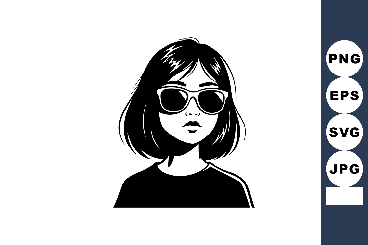 Vector illustration shows a woman with bob haircut wearing sunglasses in black and white, creating a cool and confident mood.