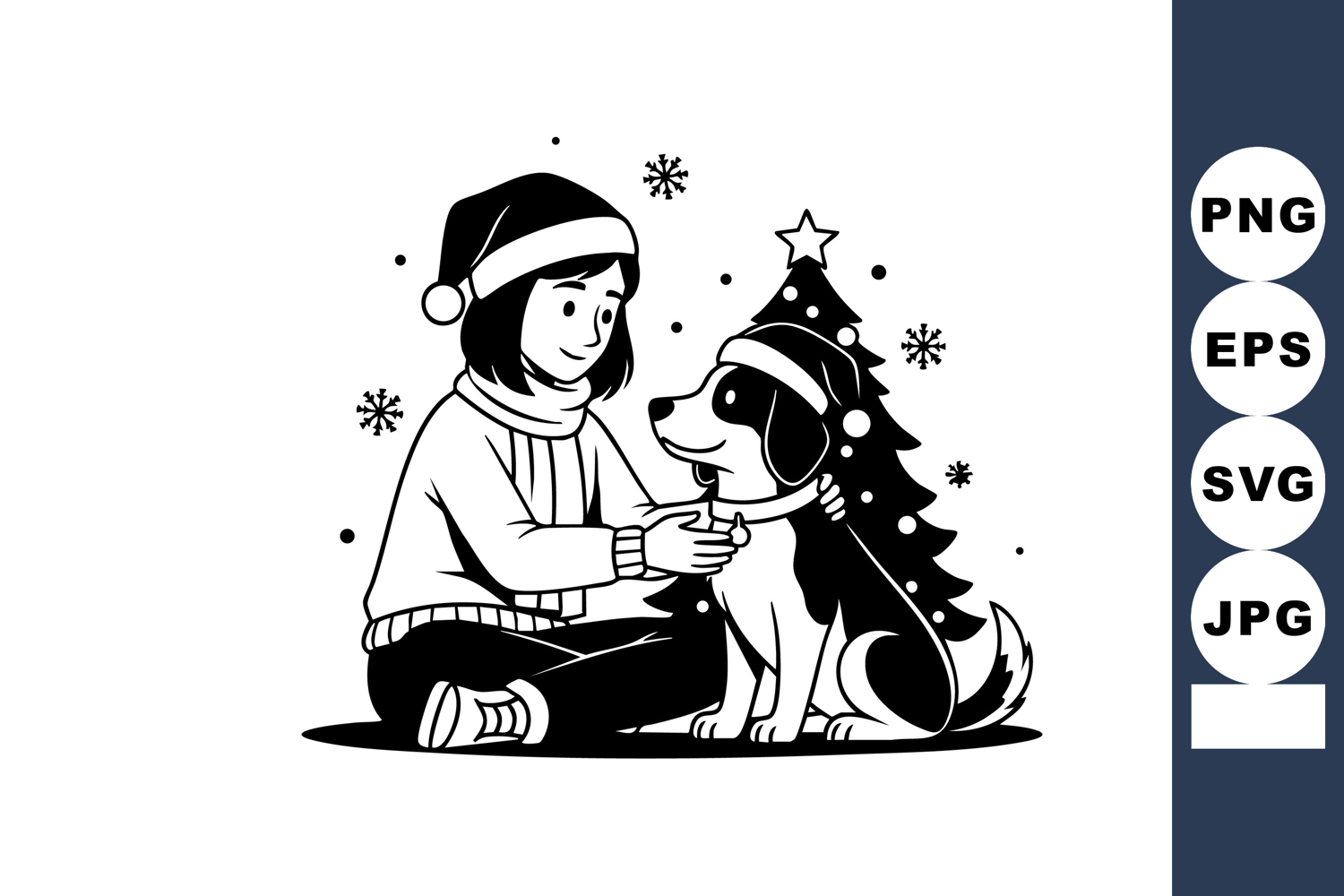 Child in winter clothes sits with a dog by a decorated Christmas tree, surrounded by snowflakes and festive holiday spirit. Cheerful mood.