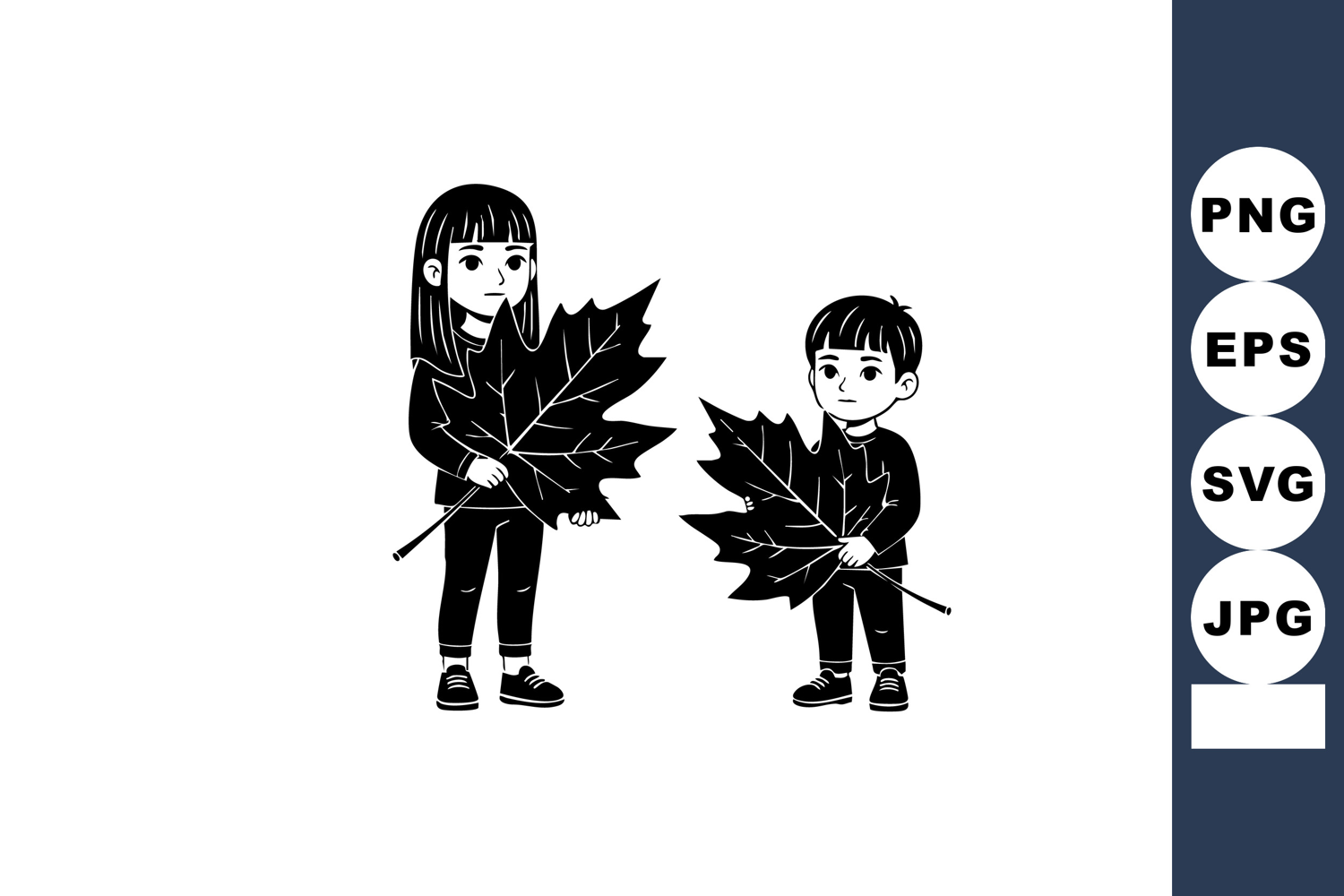 This vector shows two children holding large autumn leaves in black and white style with a simple background, creating a calm and nostalgic mood.