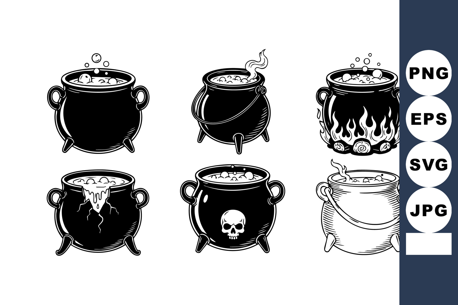Vector illustration shows six black cauldrons with bubbles, flames, and skull patterns in white background, evoking mystical and spooky mood.