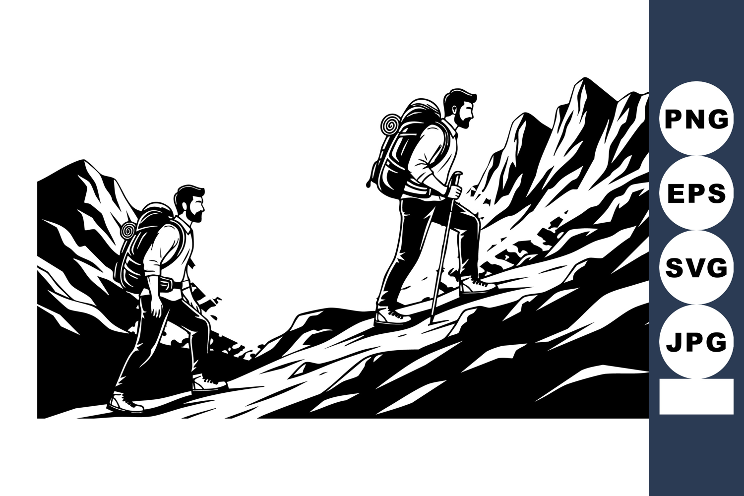 Similar Design Products to Two hikers climbing rocky mountain trail with backpacks and