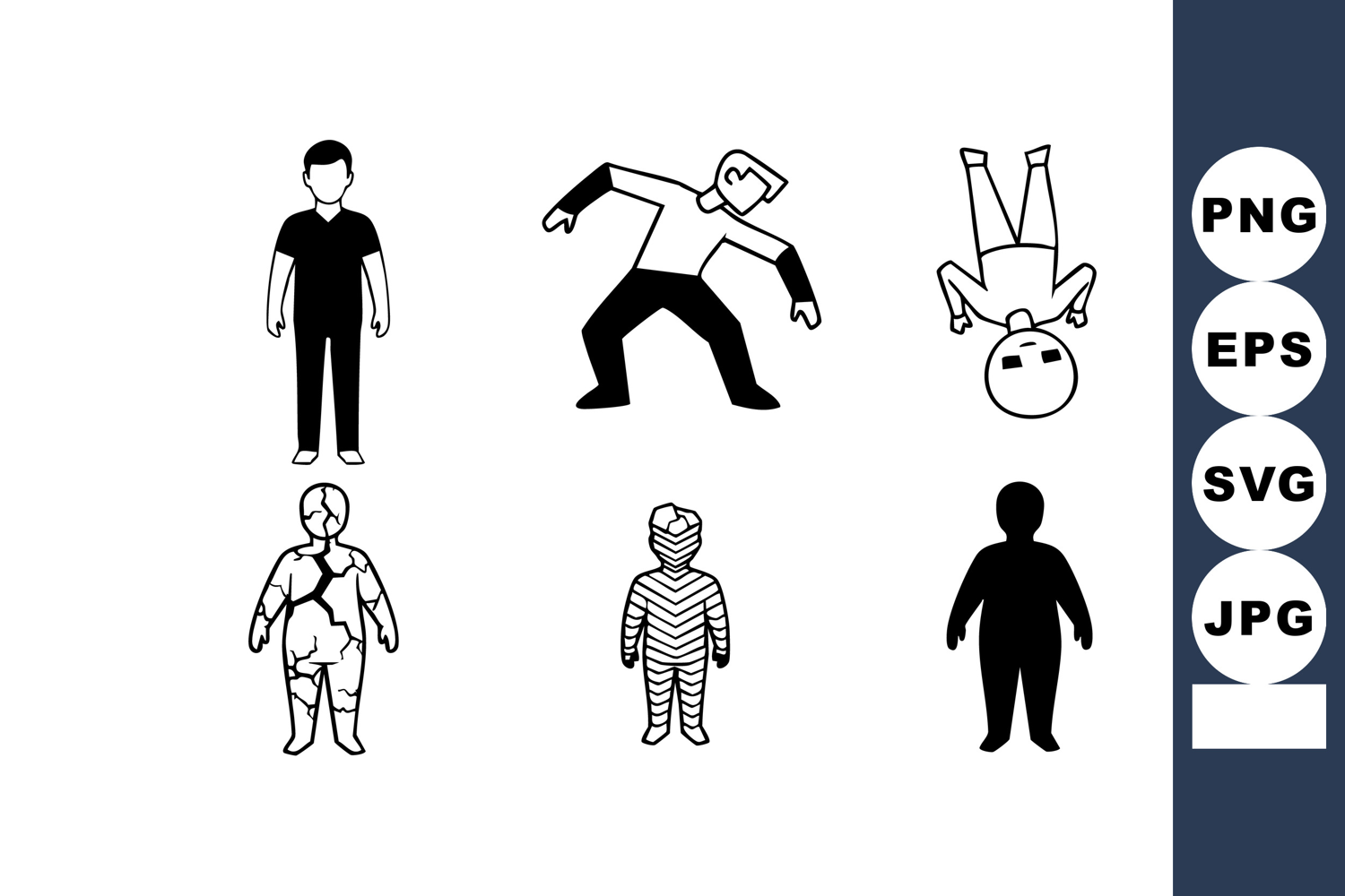 This vector file shows six human character silhouettes and outlines in various poses and styles, perfect for creative design use, minimal and dynamic.