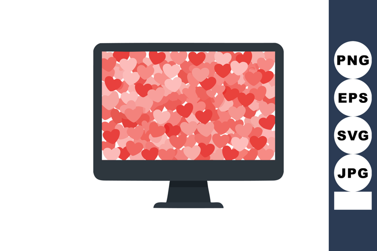 This vector image shows a computer monitor filled with red and pink hearts, representing affection and love in digital form, cheerful.
