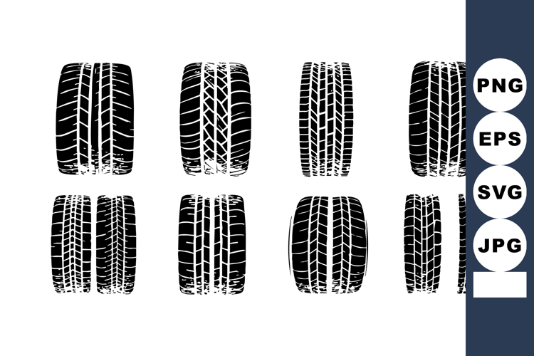 Vector set shows various tire tread patterns in black and white for automotive design and repair purposes, presented with clear contrast and detail. Practical and technical.