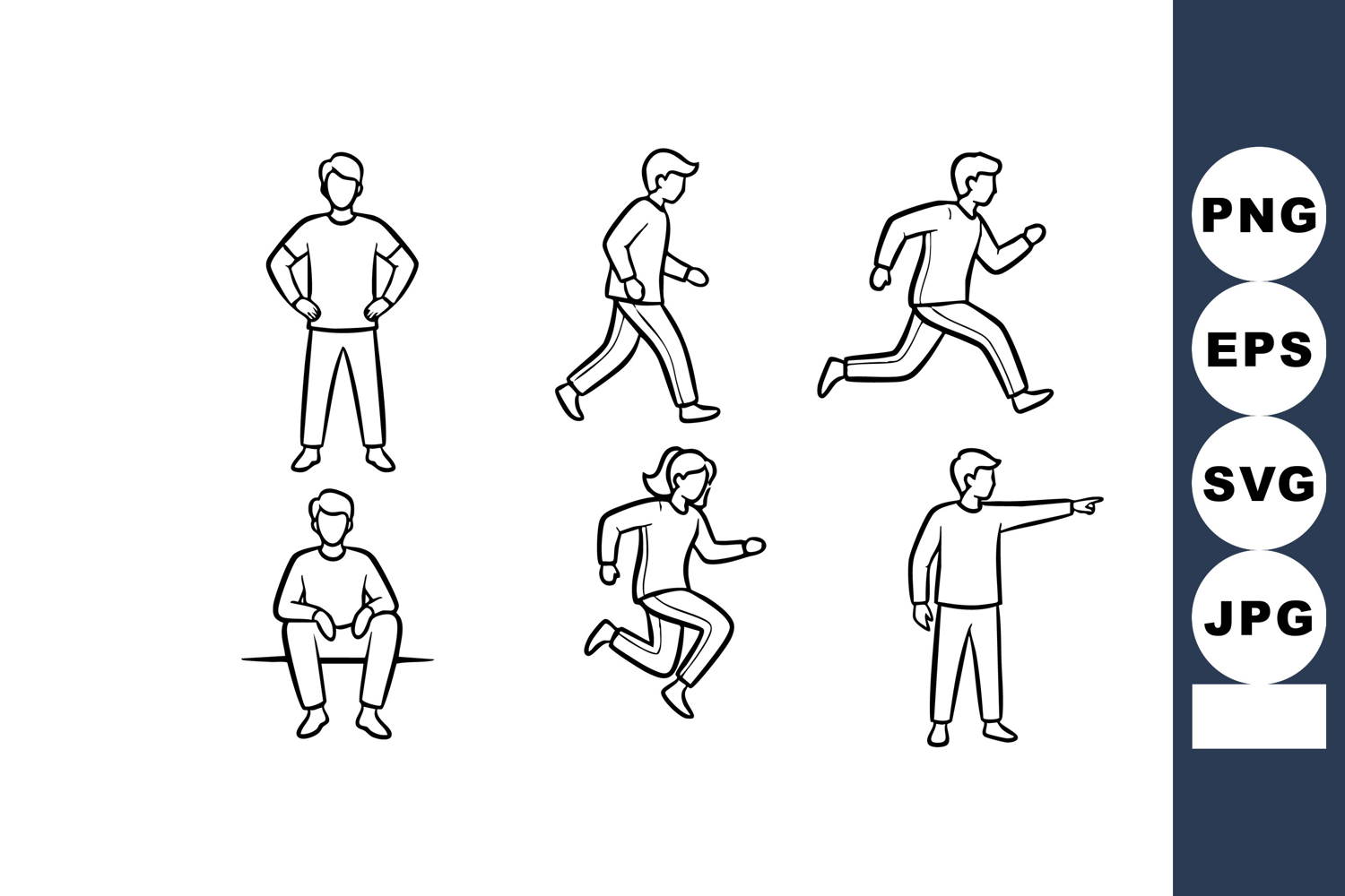 Vector shows male figure in various poses including standing, walking, running, sitting, and pointing, ideal for animation or design projects, dynamic mood.
