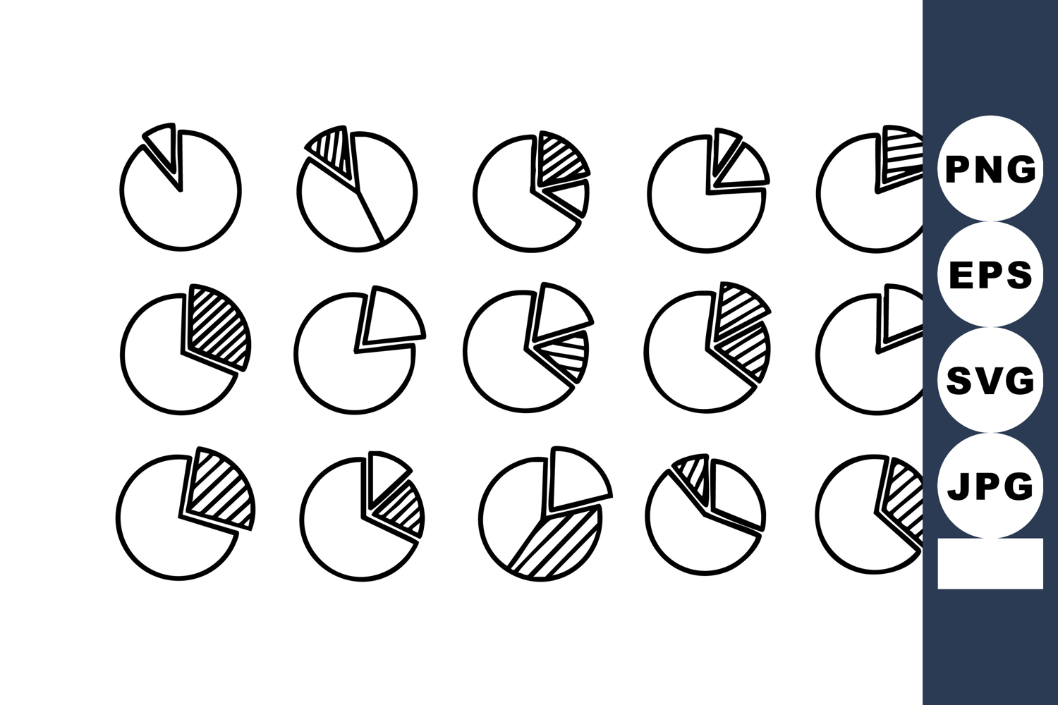 This vector features multiple black and white pie charts with different segment divisions, ideal for data visualization and infographic design, clean and minimalistic style.