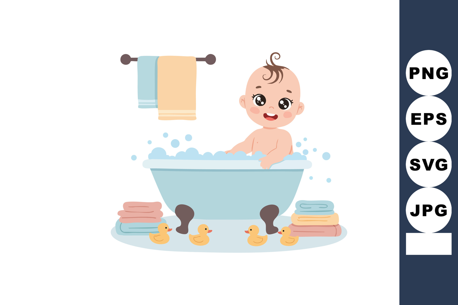 Similar Design Products to Baby taking bath in blue bathtub with rubber ducks and paste
