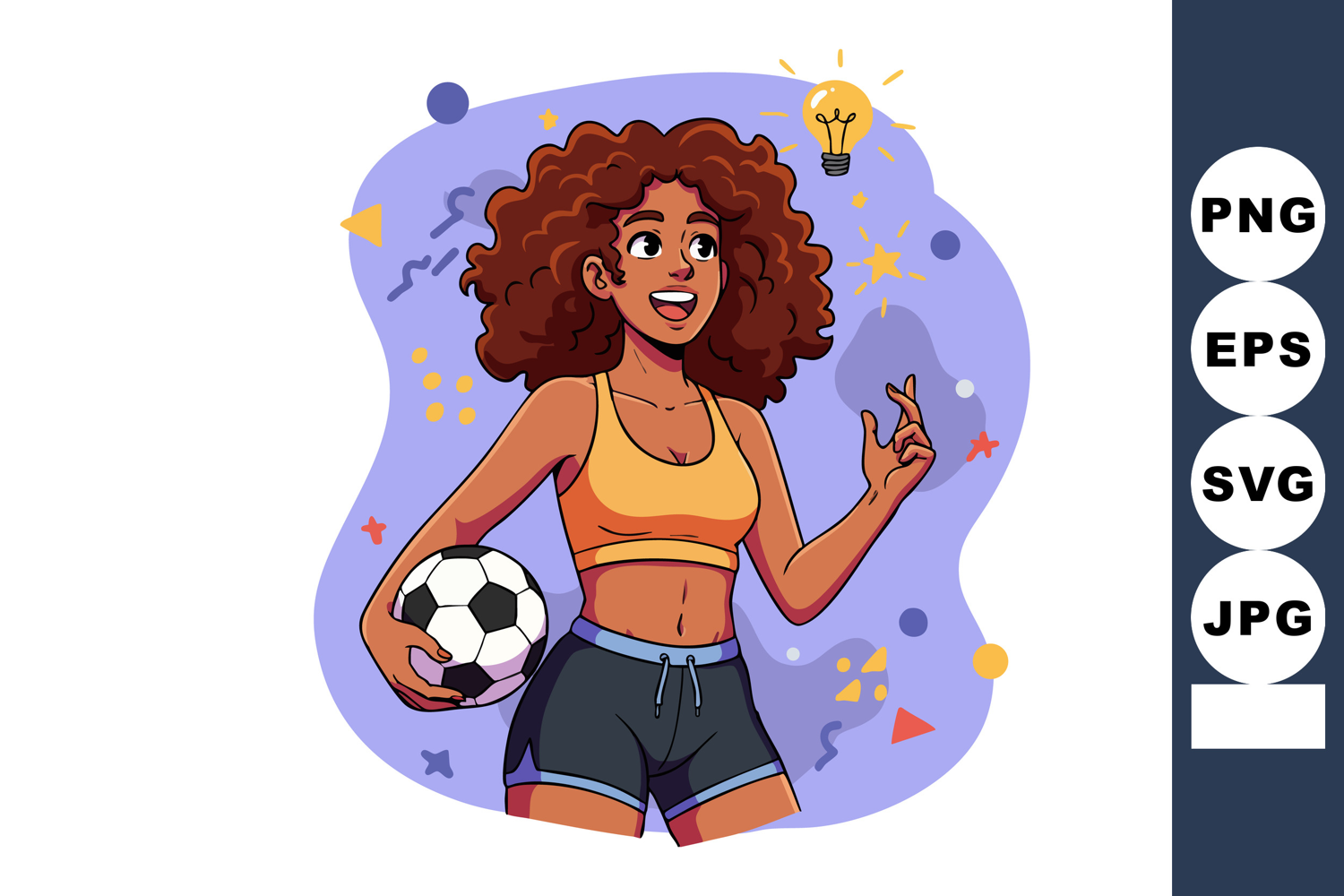 Illustration of an athletic woman with curly hair holding a soccer ball and gesturing towards a glowing lightbulb, representing inspiration and energy. Cheerful mood.