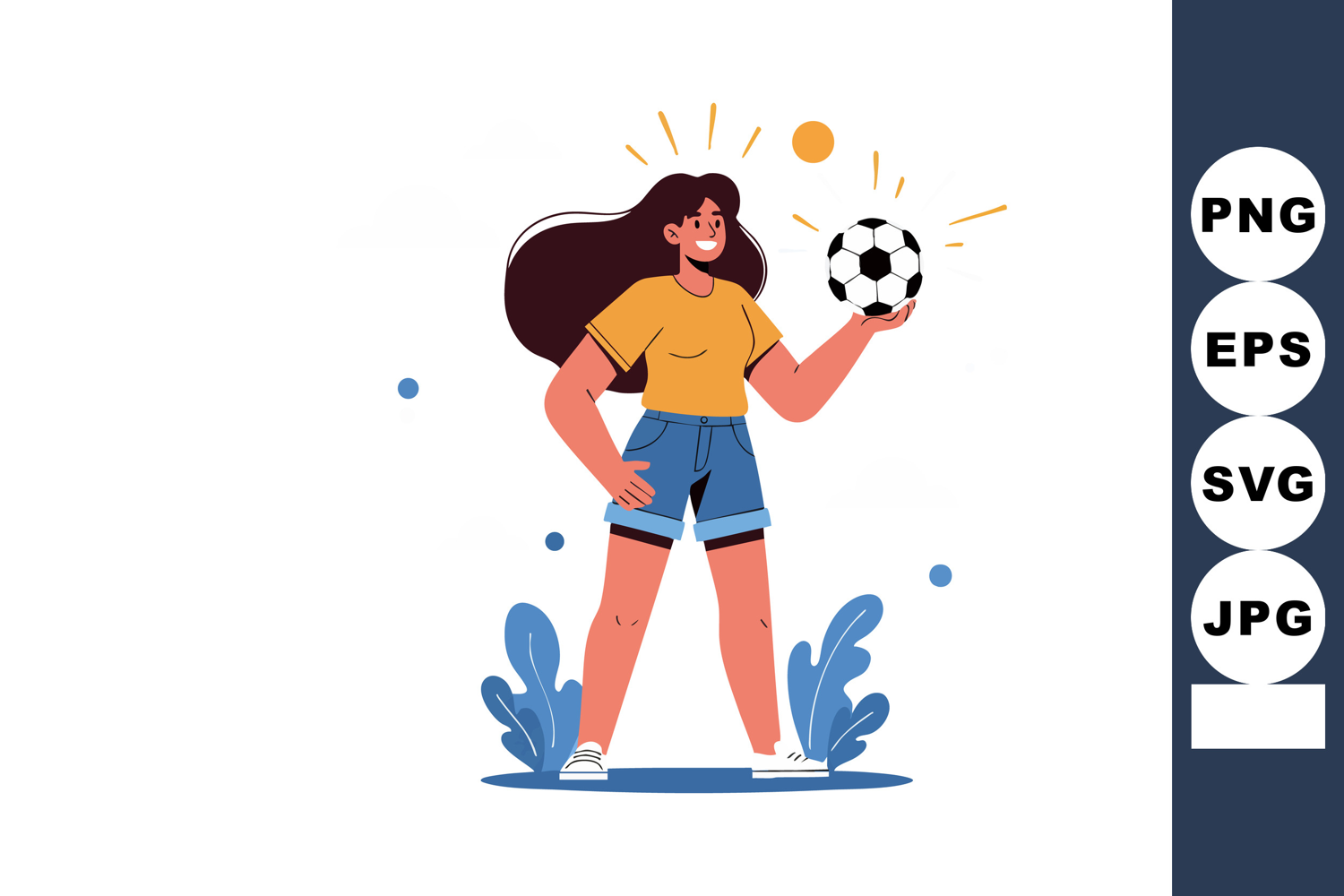 Illustration shows a confident woman holding a soccer ball wearing casual clothes with long hair and surrounded by abstract shapes and plants, energetic mood.