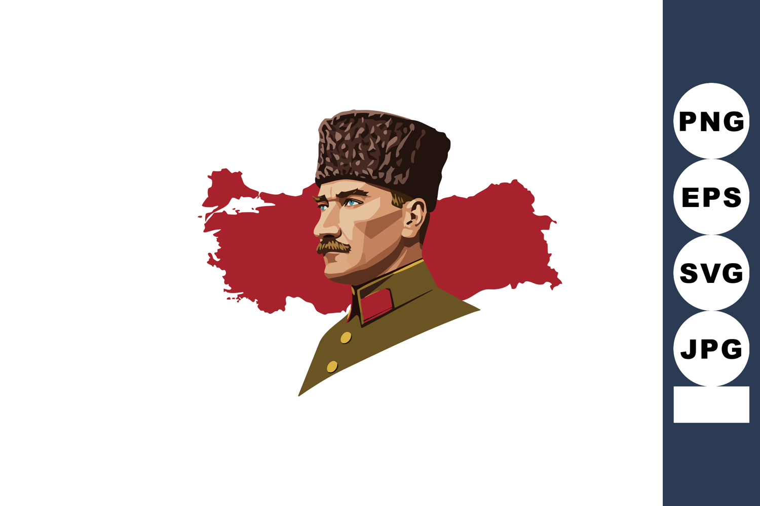 This vector shows Mustafa Kemal Atatürk’s portrait with a red Turkish map silhouette behind, symbolizing leadership and national pride. Inspirational mood.