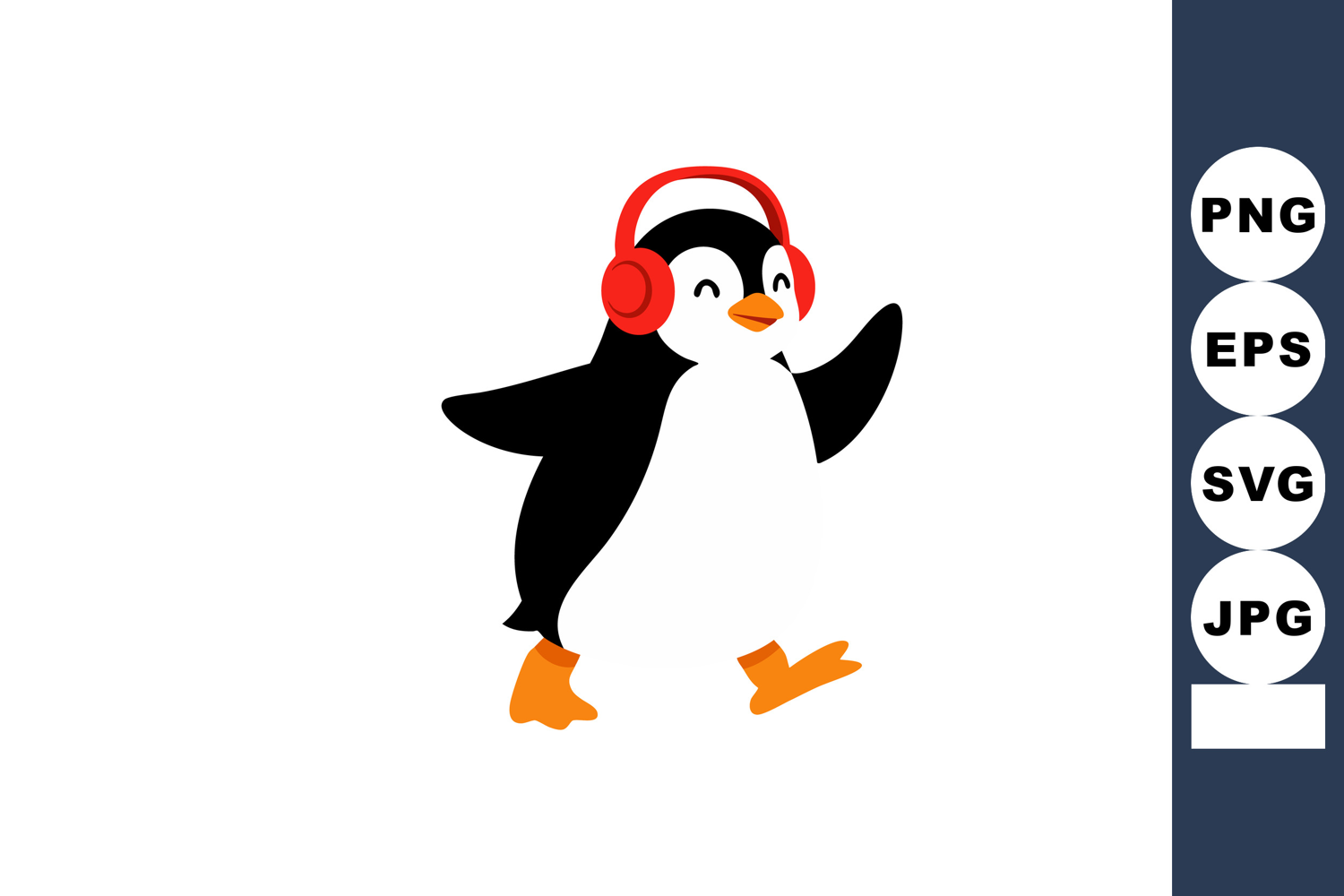 This vector shows a cheerful penguin wearing red headphones, walking and enjoying music with a joyful expression, creating a fun and lively mood.