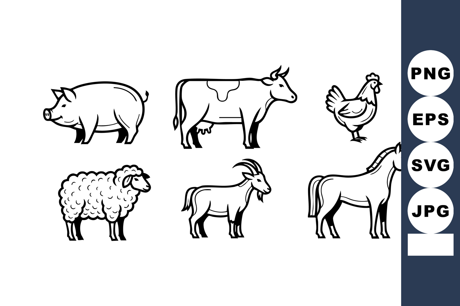 This vector set shows simple black and white outlines of common farm animals such as pig, cow, chicken, sheep, goat, and horse in a clean minimal style. Calm.