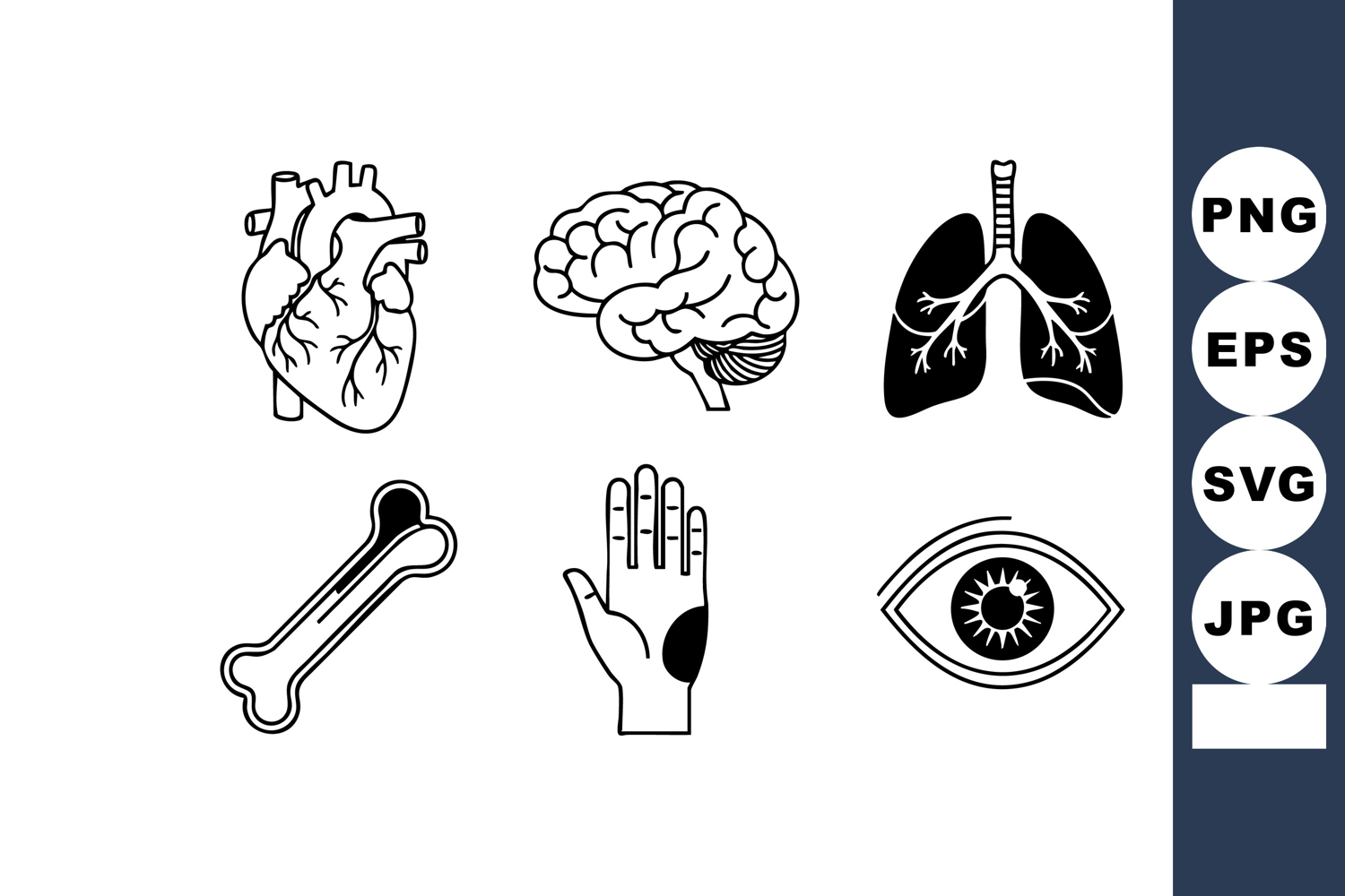 This vector set features detailed human organs including heart, brain, lungs, bone, hand, and eye in black and white style for medical and educational applications, informative and clear.