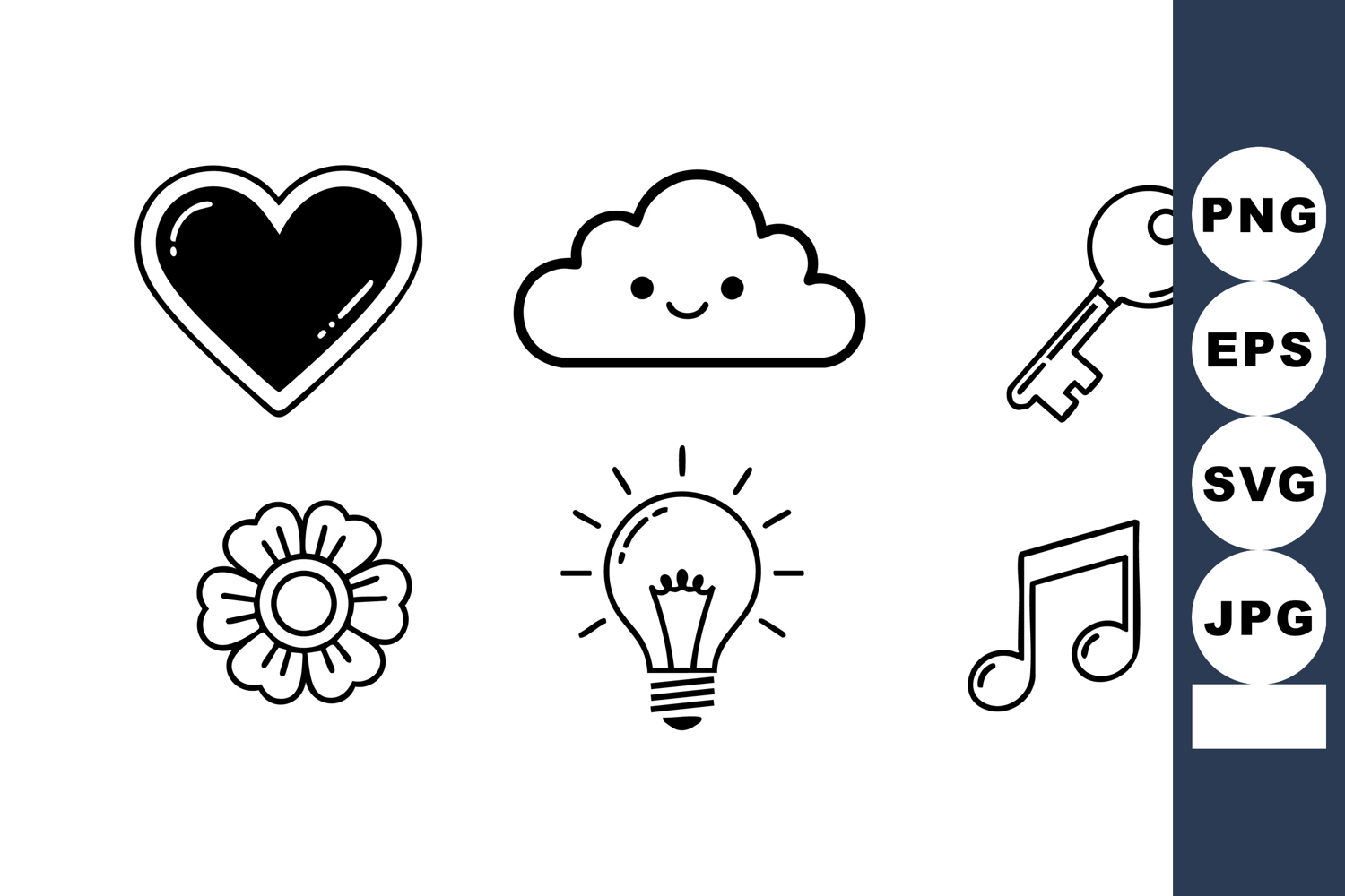 This vector image displays six simple black and white icons including a heart, smiling cloud, key, flower, illuminated light bulb, and music note. Charming and minimalistic style. Cheerful.