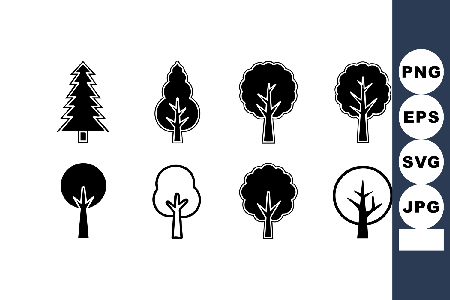 Vector set displays diverse tree silhouettes in black and white, offering simple shapes for design, nature, and environmental themes. Clean and minimalist style, flat mood.