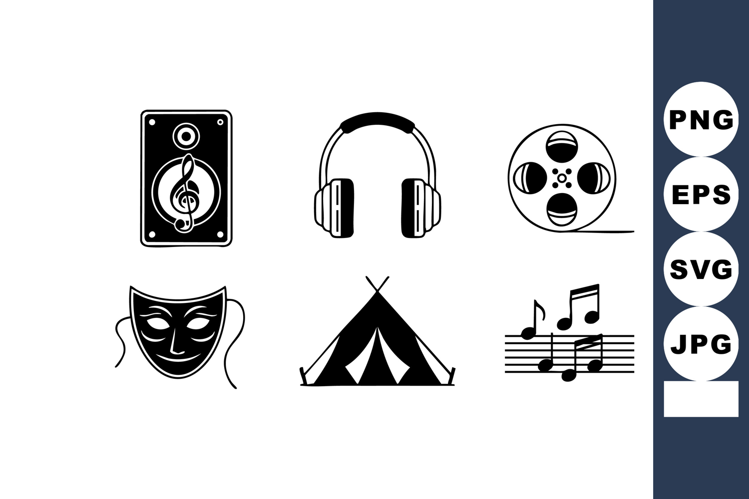 Vector illustration shows a collection of black and white music and entertainment icons such as headphones, a speaker, theatre mask, tent, and musical notes in a clean design. Playful mood.