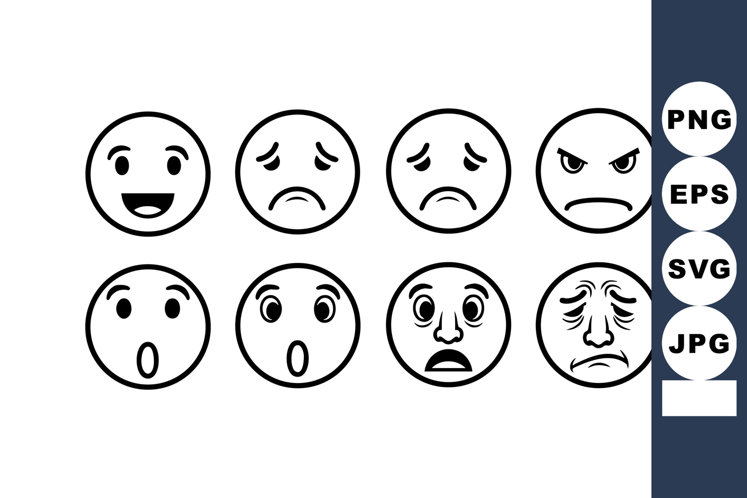 This vector image displays eight black and white emoticon faces expressing happiness, sadness, anger, surprise, and worry, arranged in two rows. The design is simple and clear, conveying multiple moods. Cheerful and expressive.