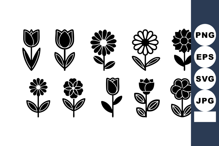 This vector file presents a collection of minimalist black flower icons including tulips and daisies in simple silhouette style, suitable for various design uses and creative projects. Calm.