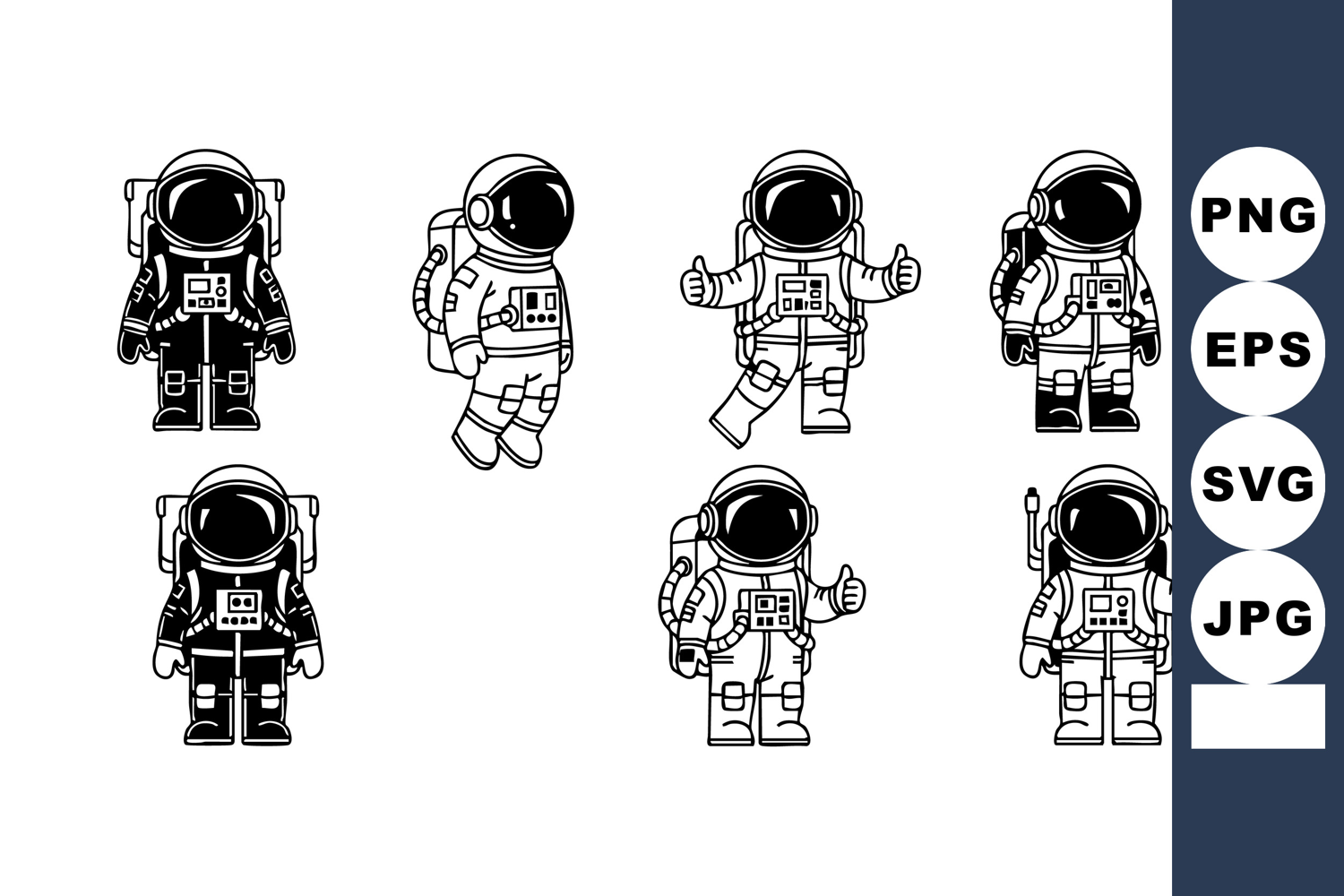 This vector features seven astronauts in detailed spacesuits showing various standing and thumbs-up poses, rendered in black and white line art style, conveying exploration and optimism.