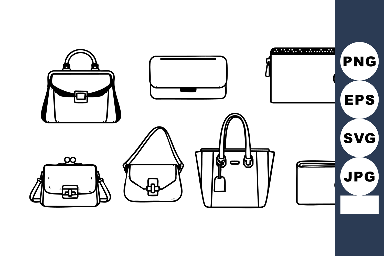 This vector set features black and white handbag icons with different shapes and styles suitable for fashion design and accessory illustrations, presented in a clean minimalist style. Calm and professional mood.