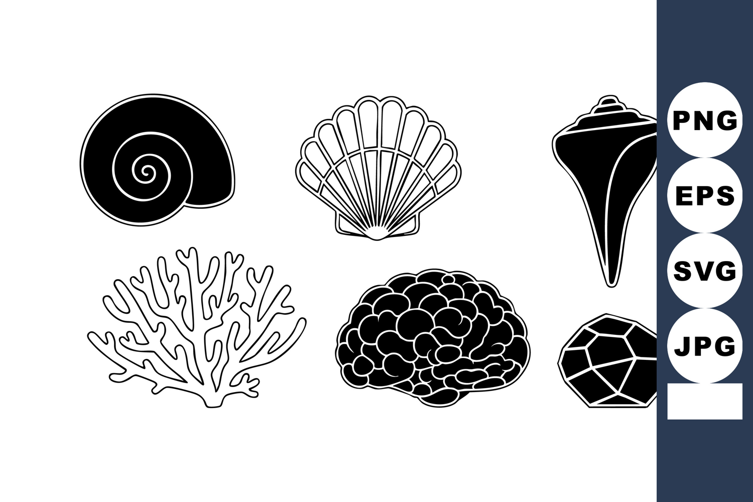 This vector image shows six different marine shells and coral shapes in black and white, perfect for underwater-themed projects and decorative design work. Clean and minimal style.