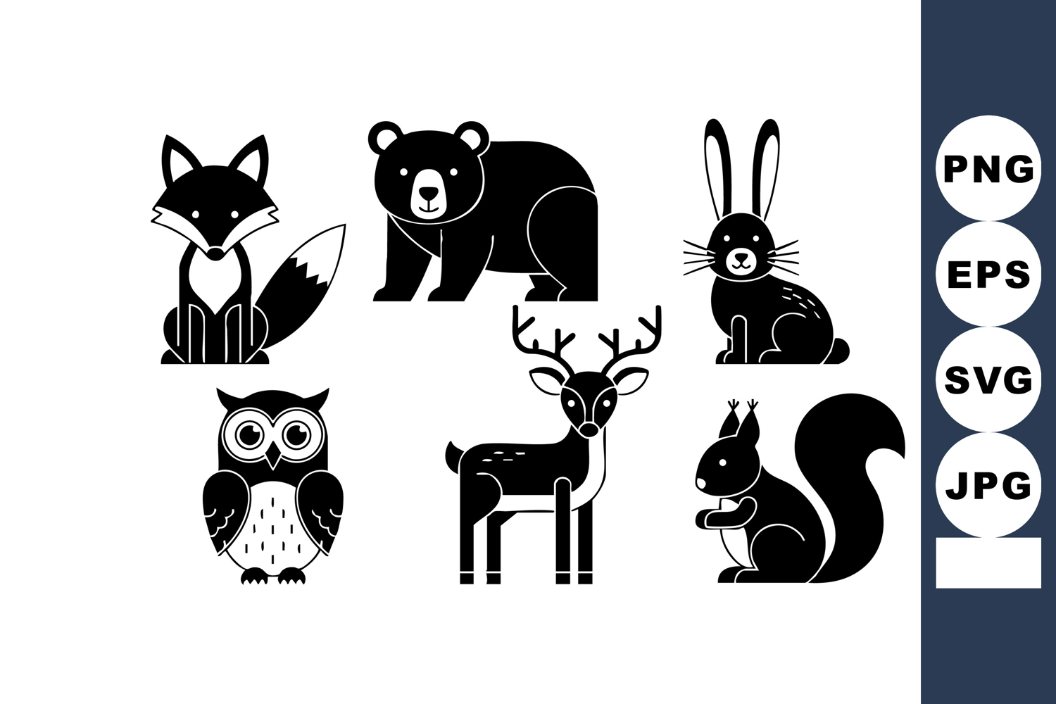 This vector features black silhouettes of forest animals such as fox, bear, rabbit, owl, deer, and squirrel. The design is simple, clean, and nature-inspired, evoking a calm mood.