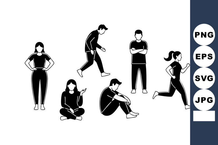 This vector features people in various poses including standing, walking, sitting, and running, depicted in monochrome style, showing diversity of motion and stillness. Calm mood.