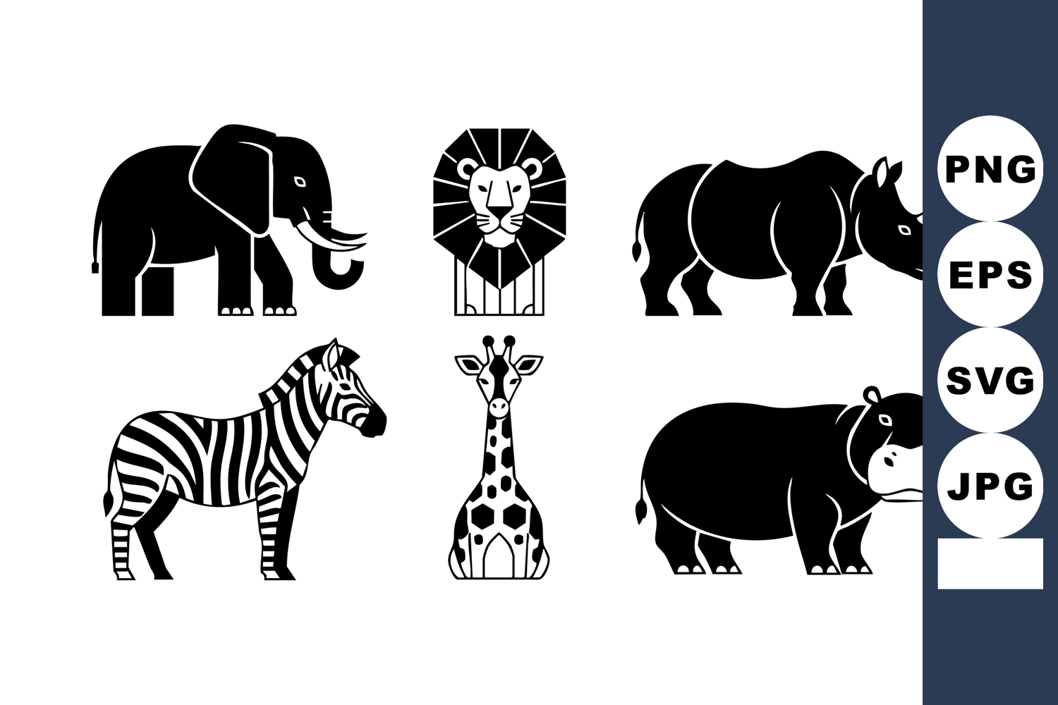 This vector set displays iconic African wildlife including elephant, lion, rhinoceros, zebra, giraffe, and hippopotamus in bold black silhouettes. The collection is clean and minimalistic, suitable for diverse uses. Stylish.