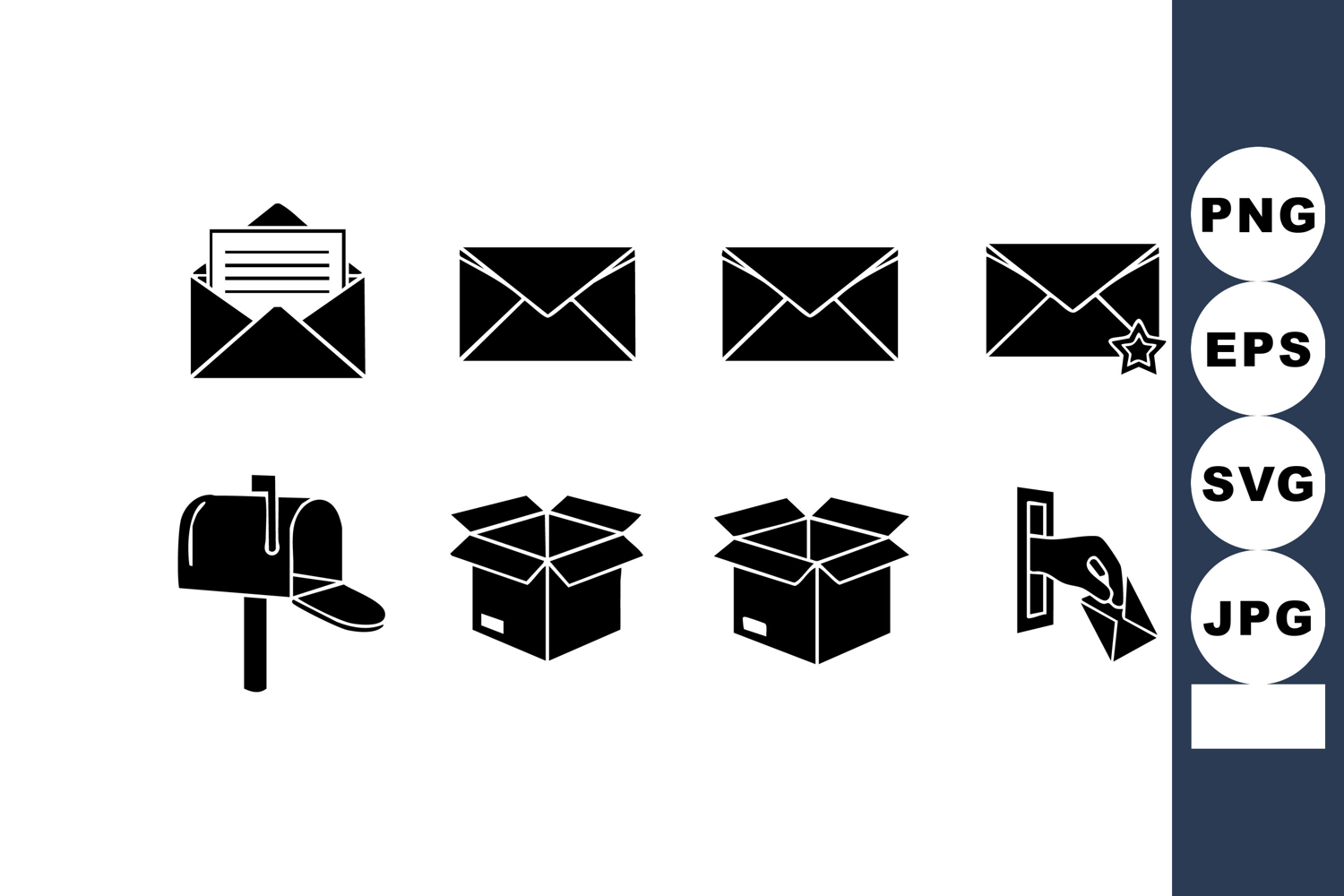 This vector set displays mail and package delivery icons including open and closed envelopes, mailbox, cardboard boxes, and hand inserting mail, presented in simple black silhouette style, clear and functional.