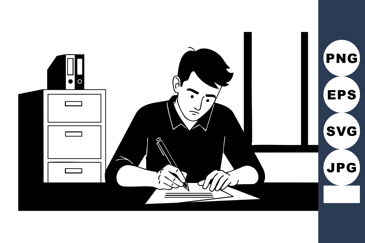 This vector depicts a young man focused on writing notes at his desk in a simple black and white office environment, conveying concentration and productivity in a minimalist style.